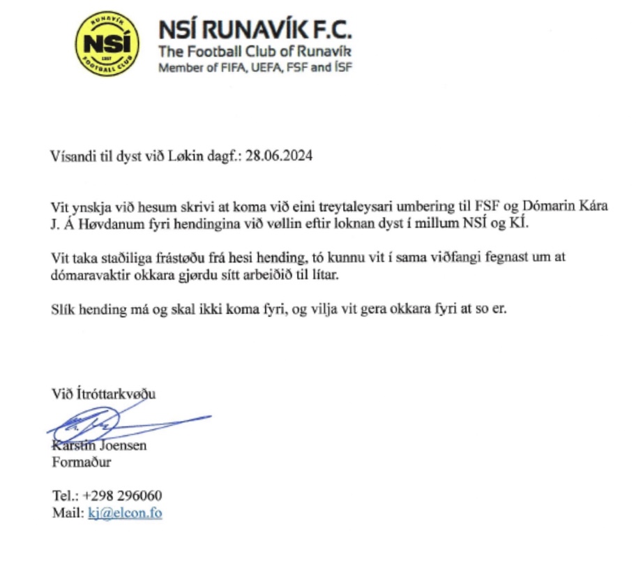 – Vit ynskja við hesum skrivi at koma við eini treytaleysari umbering til FSF og dómaran Kára J. á Høvdanum fyri hendingina við vøllin eftir loknan dyst millum NSI og KÍ.