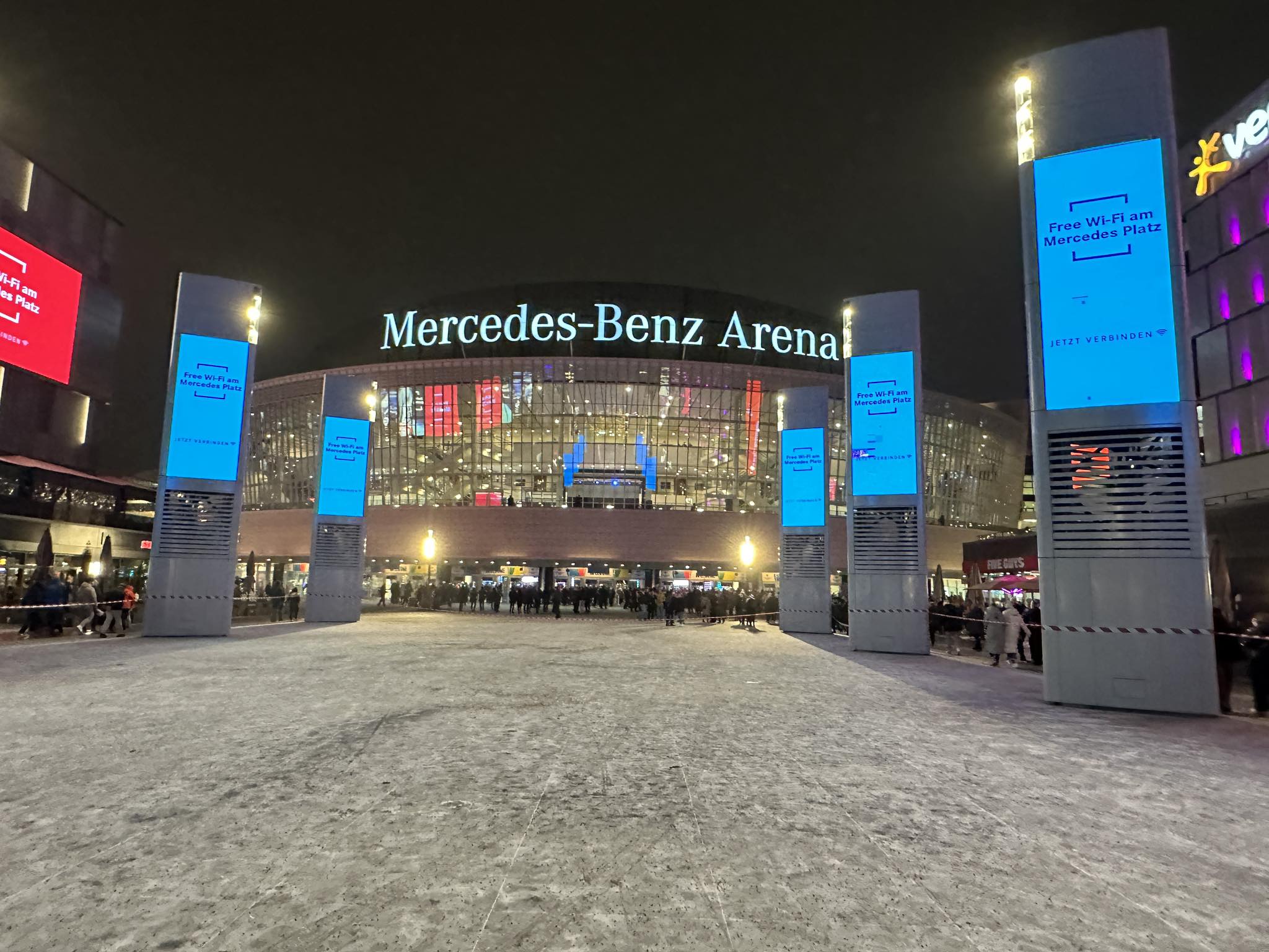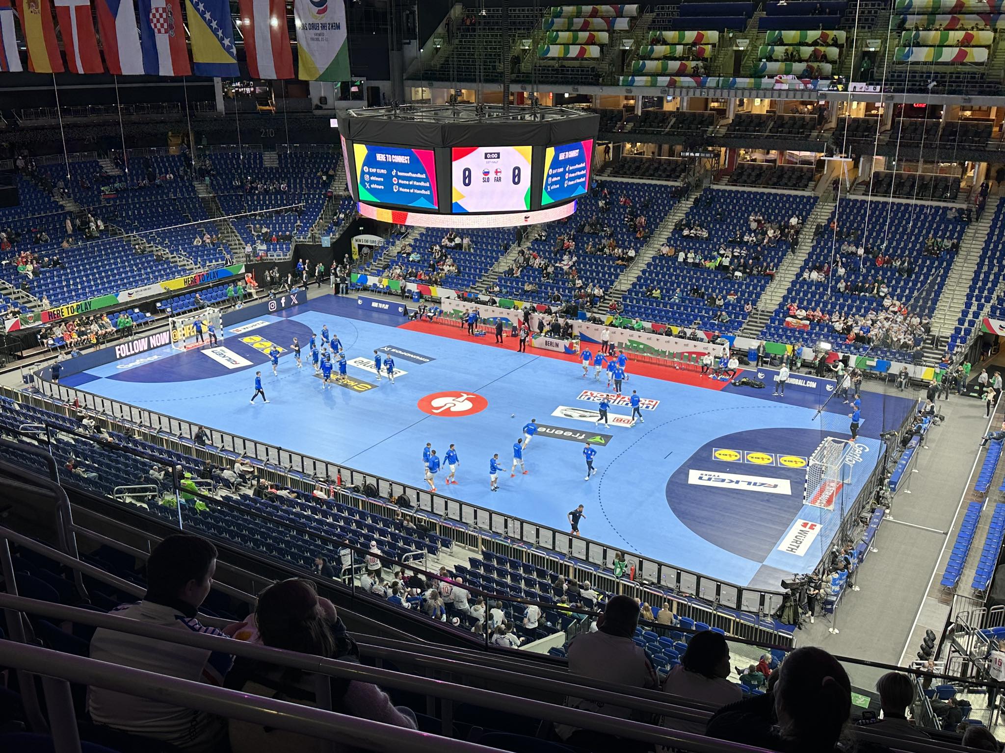 Føroysku spælararnir hava verið á vøllinum í stóru høllini í góða løtu og hita upp.