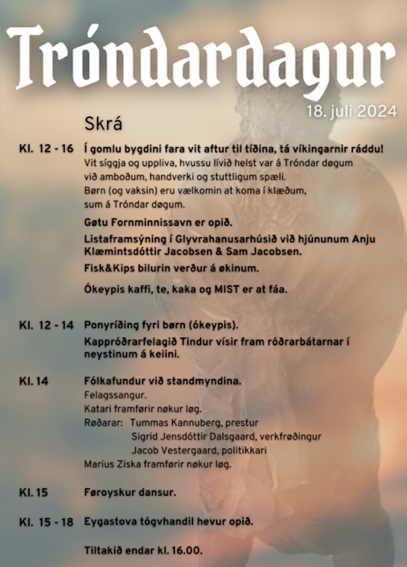 Vit gleða okkum at síggja tykkum til Tróndardagin – ein dagur har føroyskur dansur, fólkafundur, felagssangur, røður og livandi tónleikur seta dám á dagin."
