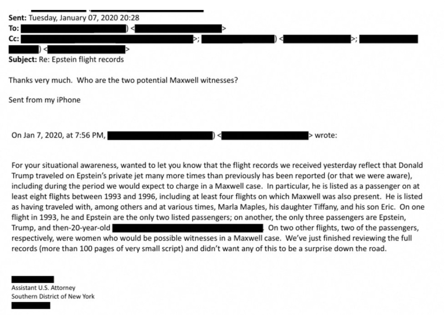 Ákærin aftanfyri teldupostin greiðir eisini frá, at flogloggar vísa, at Trump "ferðaðist við privata jetflogfarinum hjá Epstein nógvar fleiri ferðir enn áður varð greitt frá (ella sum vit vóru vitandi um)".