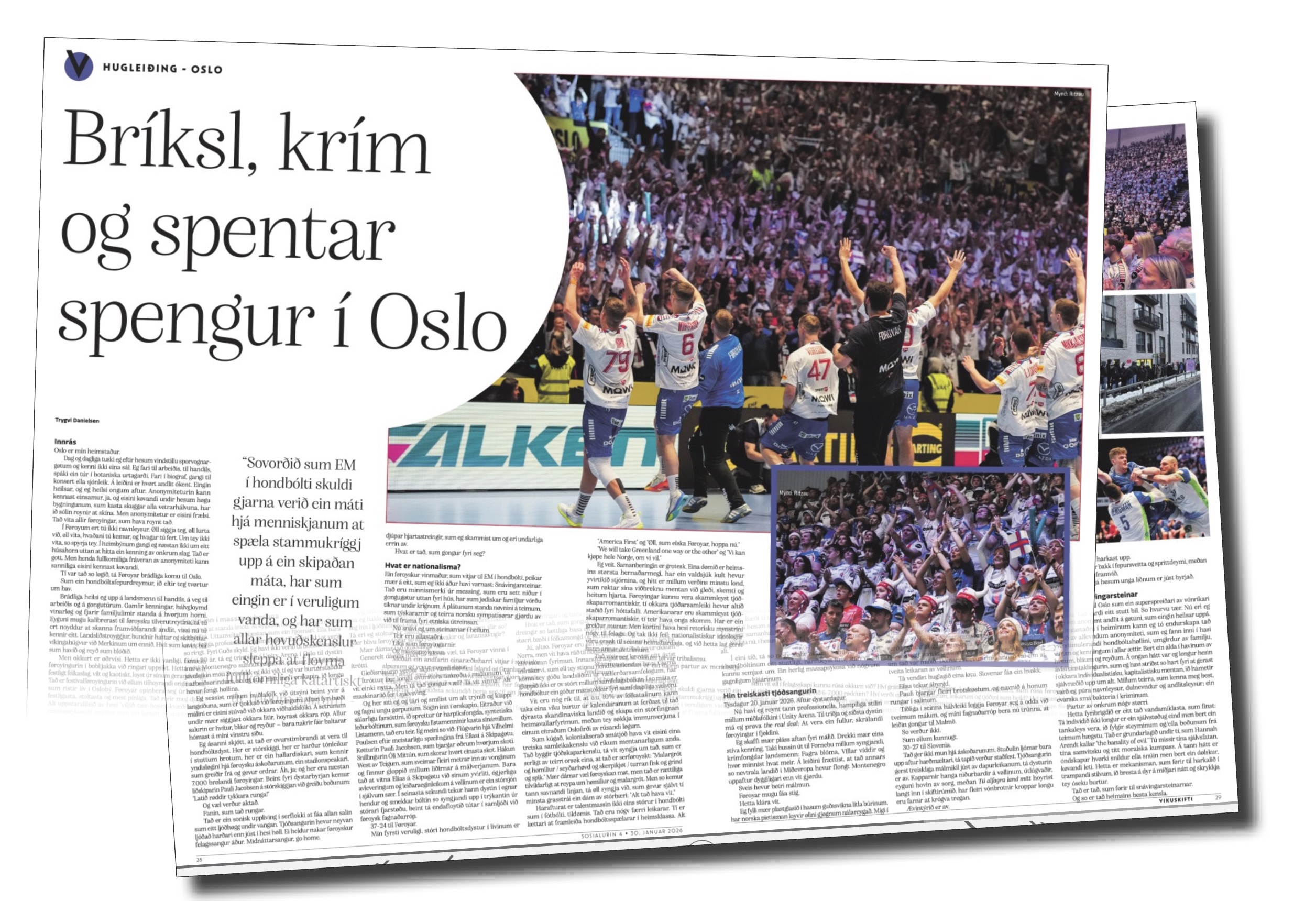 Glitrandi góður. Trygvi eygleiðir tveir av hondbóltsdystunum hjá føroyingum í Oslo, har hann sjálvur býr. Í einum føroyskt miðlaðum gerandisdegi - har tú neyvan fært samanhang í útvarpstíðindini, tí tey eru so út av lagið illa lisini; gudviti, hvussu tey eru skrivaði, men til upplestur rigga tey ikki, tí tey verða tað bera kønk - er tað ein rár hending, at tú sum lesari, lurtari ella hyggjari kennir teg virðismettan, og kanst fara mettur frá at hava konsumerað eitt miðlaprodukt. Tað hendi í hesum føri. Eg bleiv enntá svangur eftir meir.