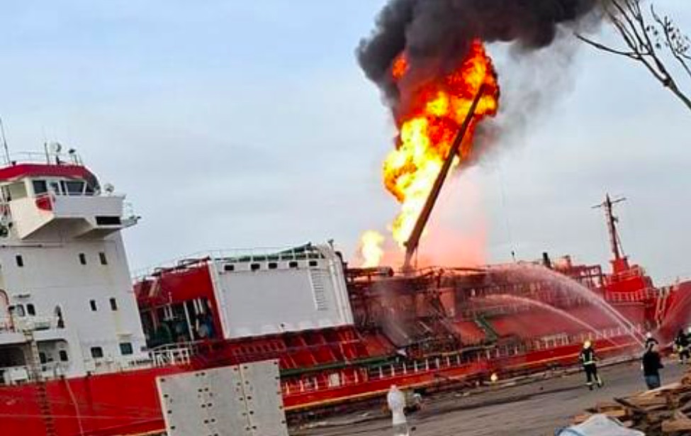 Í gjár kom eldur í eitt gasstangaskip í ukrainska havnarbýnum, Izmajil, sum liggur í Odessa-regiónini heilt har suðuti í Ukraina, og BBC visti at siga, at hetta er eitt skip, sum siglir undir turkiskum flaggi.