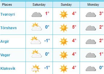 Hósdagin verður andøvsgul upp í ein strúk av suðri, 8 til 13 m/s, sum út á dagin øtlar upp í hvassan vind upp í skrið, 15 til 20 m/s. SKýggjað og stundum regn og hitin um dagin millum 5 og 8 stig, um náttina millum 4 og 7 stig.