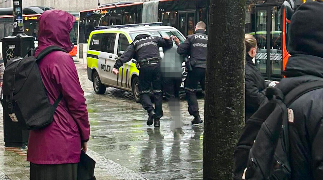 Á myndini omanfyri, sum tv2.no eigur, fer løgreglan avstað við einum yngri manni, sum ikki dugdi sær hógv, tá hann skuldi upp í ein buss í Noregi í dag.