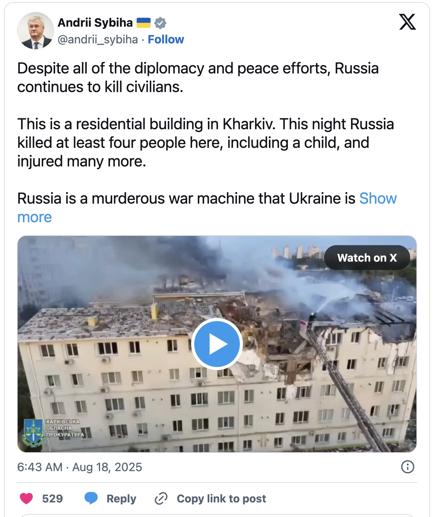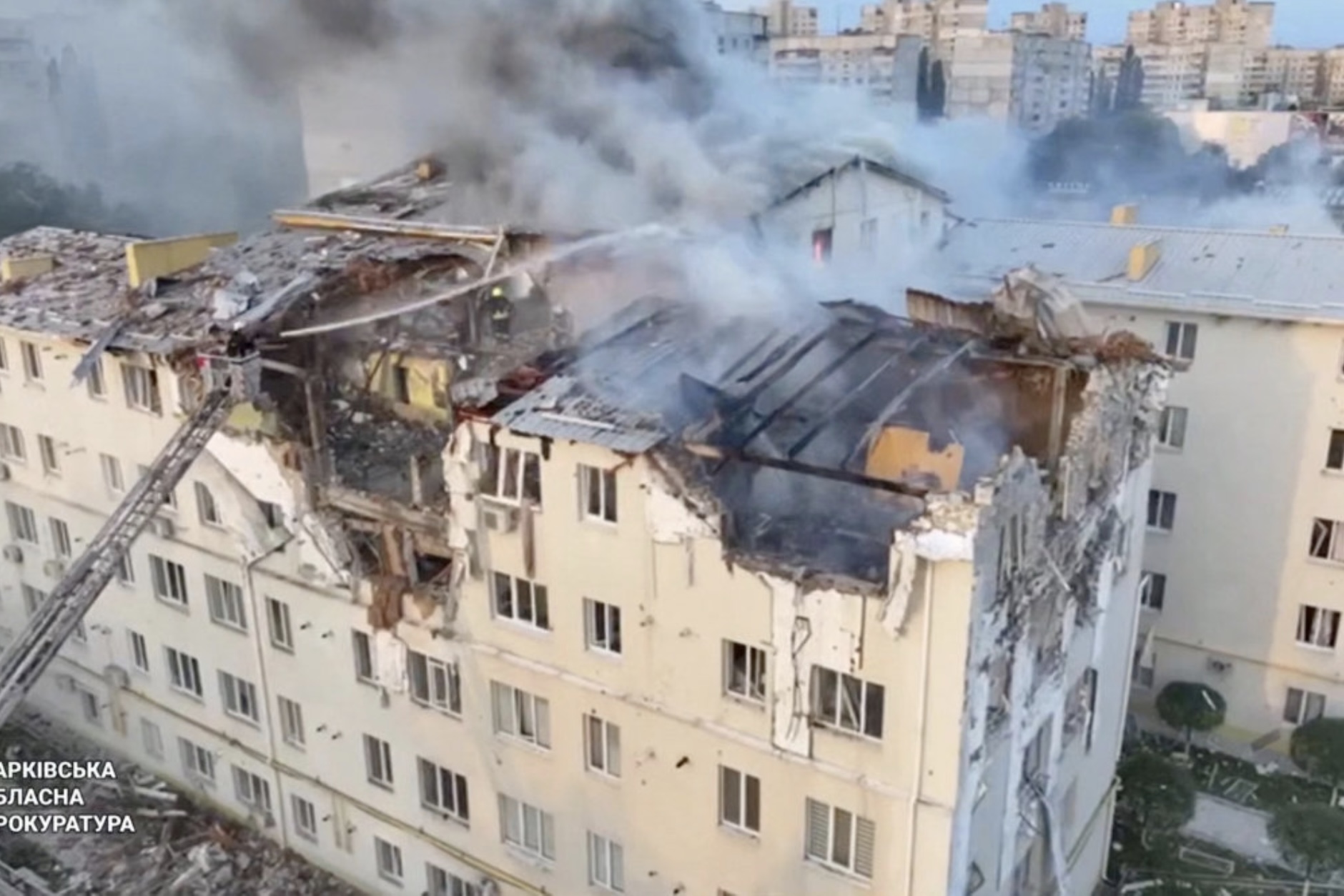 Oleh Synyehubov, guvernørur í økinum, sigur, at eitt rakettálop í gjár knústi umleið 1.000 vindeygu í ymiskum bygningum í býnum sundur.