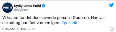 Tað seinasta nýggja í málinum er, at maðurin eftir leiting í tveir tímar er funnin aftur í øllum góðum og hevur tað gott.