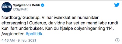 Danska løgreglan er í morgun í holt við eina sonevnda "humanitera" leiting í Guderup. Orsøkin er, at eitt vitni hevur sæð ein mann renna runt úti í berum undirbuksum, samstundis sum sonevndi chillfaktorurin er umleið 12 kuldastig í økinum.