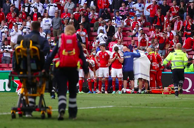 Christian Eriksen gav ikki tekin frá sær, meðan hann lá á vøllinum. Samarittar, læknar og onnur hjálparfólk góvu honum hjartamassagu. Hann bleiv síðani fluttur á børu av Parkini.