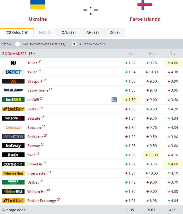 Hóast greiðu framgongdina hjá føroyska liðnum, so er Ukraina greiður favorittur hjá 16 altjóða veddingarfyritøkum.