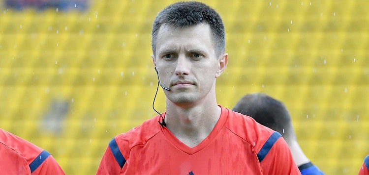 Denys Shurman var fjórði dómari, tá føroyska A-landsliðið tapti 1-3 til Eysturríki í einum HM-undankappingardysti á Ernst Happel leikvøllinum í Wien 28. mars í 2021.