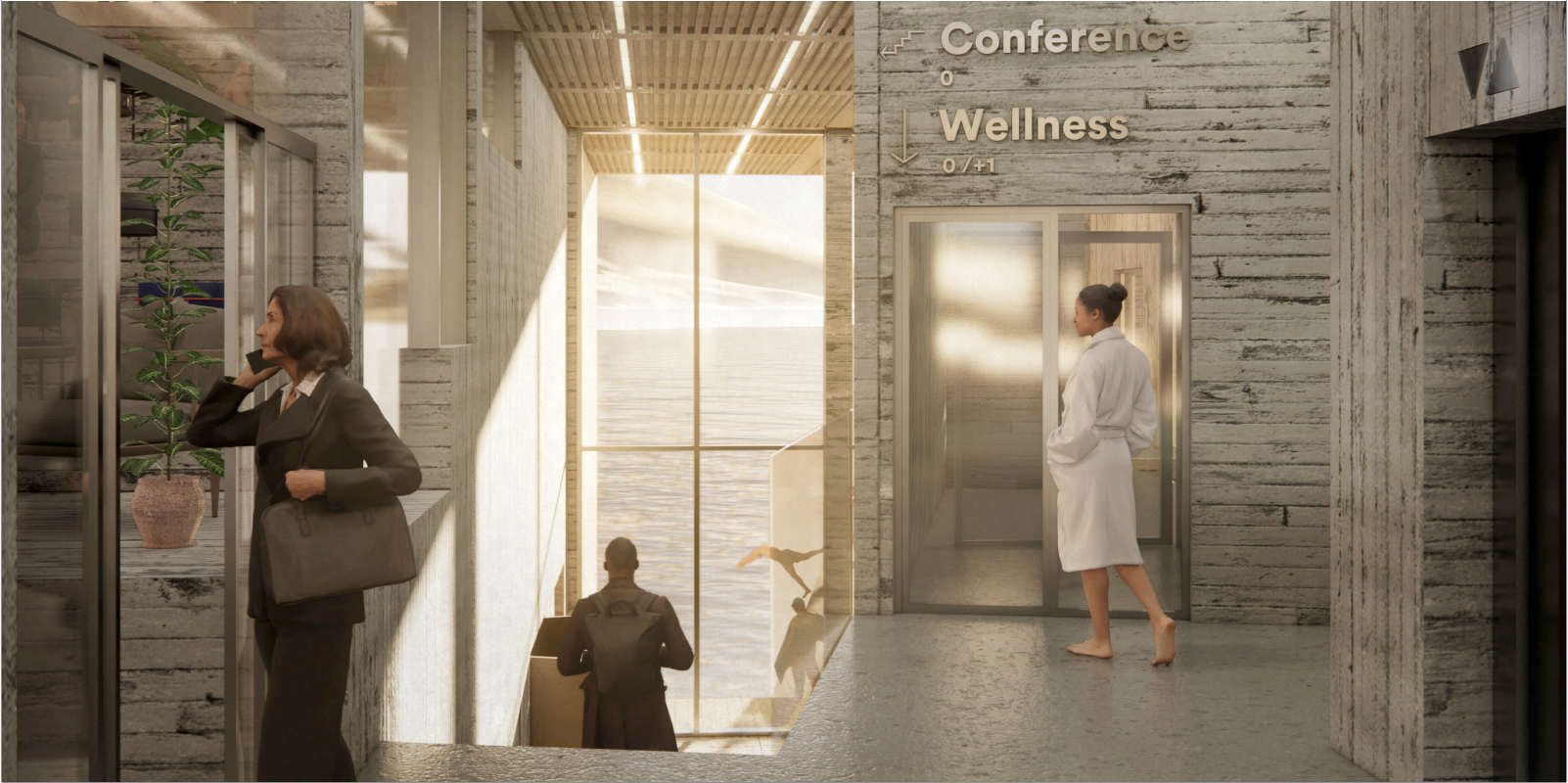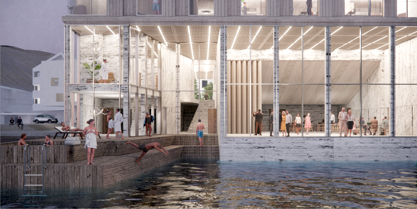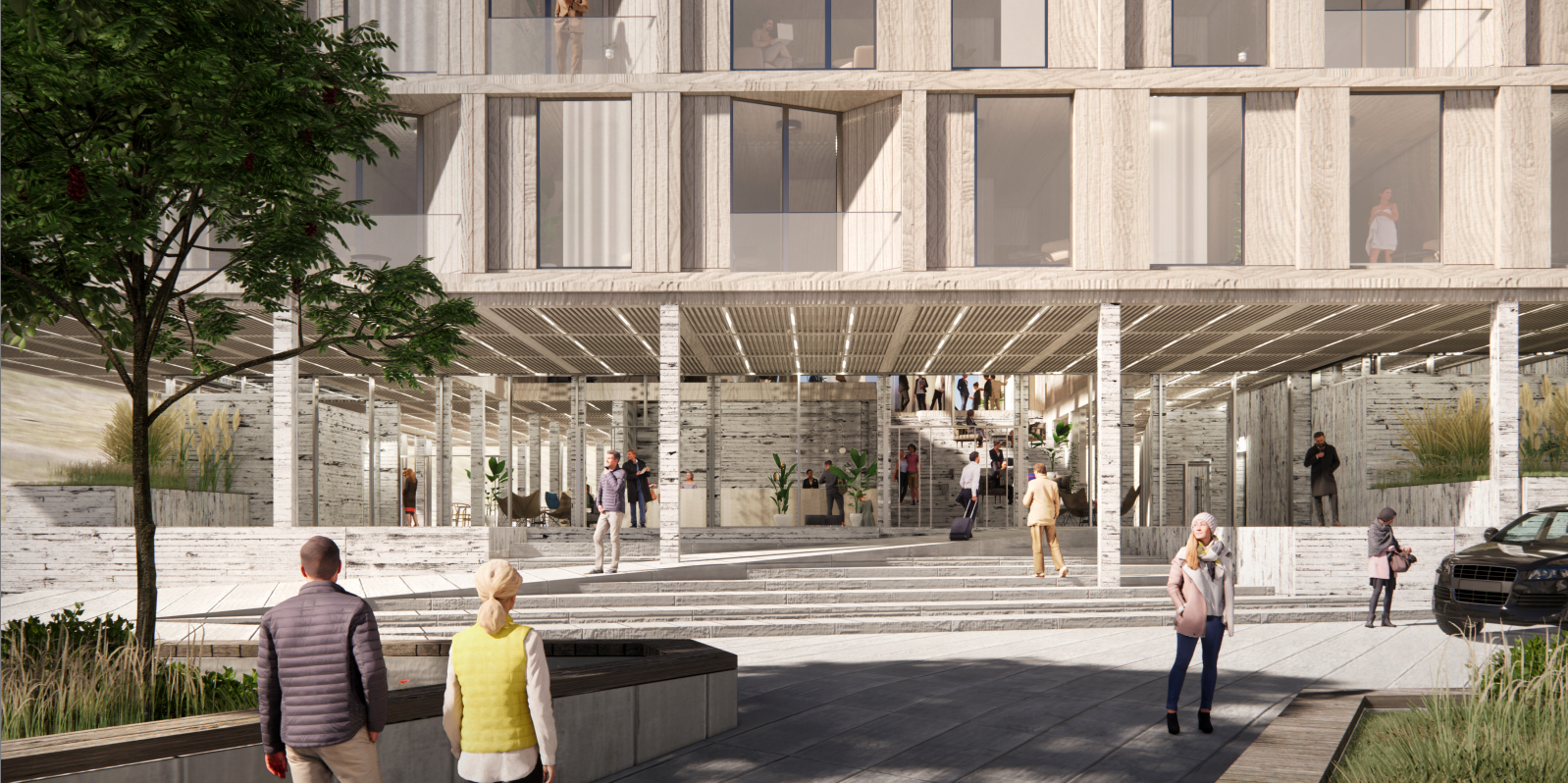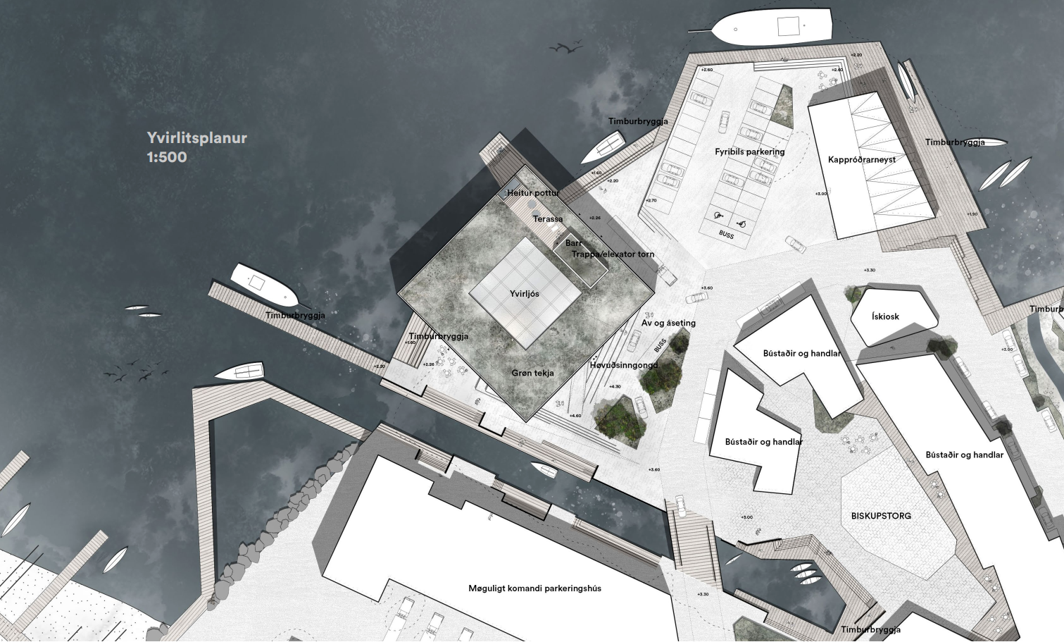 Høvuðsinngongdin verður suður móti Biskupstorgi. Nakað eystan fyri hotellið er nýggja kappróðrarneystið, og miðskeiðis millum neystið og hotellið verður fyribils parkering við inngongd til ráðstevnuhøll og vælveruøkið á hotellinum.