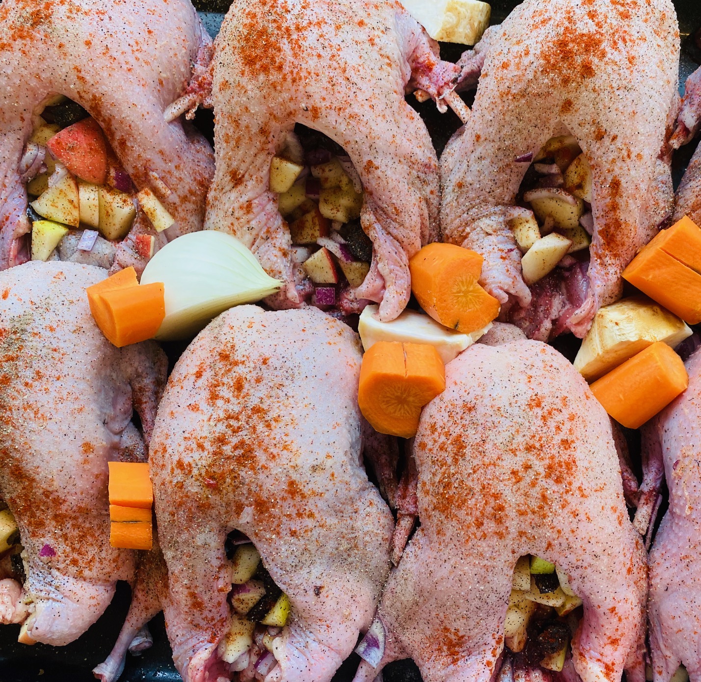 Krydda við salti, pipari, hvítleykspulvuri og paprika ella øðrum kryddurtum og legg í eitt ovnfast fat. Koyr leyk, selleri og gularøtir í fatið saman við eitt sindur av vatni