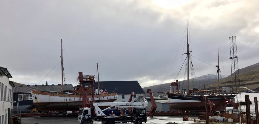 Í løtuni standa M/S Thorshavn og sluppin Johanna TG326 á beding á Skipasmiðjuni í Vági.