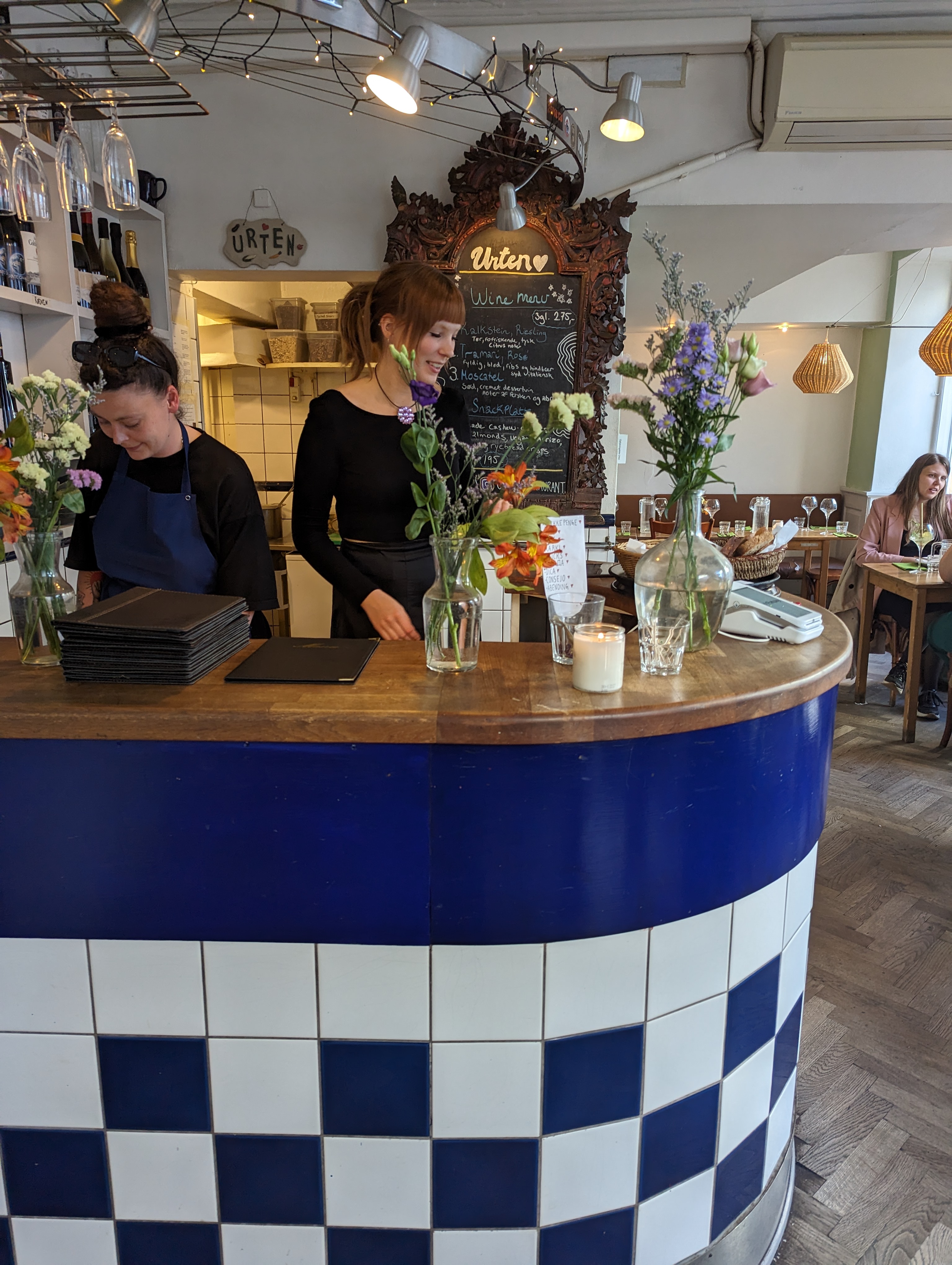 Tað sær nokkso funky út inni í matstovuni, serliga orsakað av blá-hvítu flisunum á barrini. Her er ikki so stórt, og tað ger tað eyka hugnaligt.