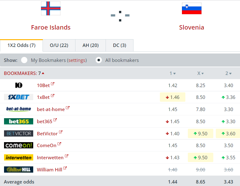 Oddsini uppá føroyskan sigur liggja millum 1.42 og 1,46. Oddsini uppá sigur til Slovenia liggja millum 3,30 og 3,60.
