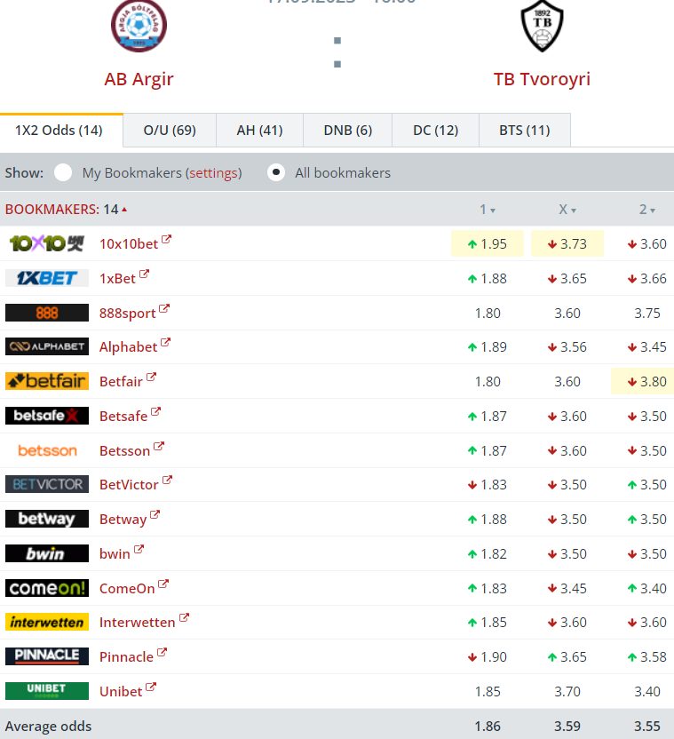 Miðaloddsini upp á heimasigur til AB eru 1,86. Miðaloddsini upp á útisigur til TB eru 3,55.