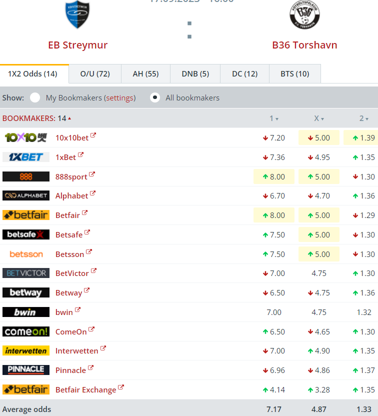 Miðaloddsini upp á heimasigur til EB/Streym eru 7,17. Miðaloddsini upp á útisigur til B36 eru 1,33.
