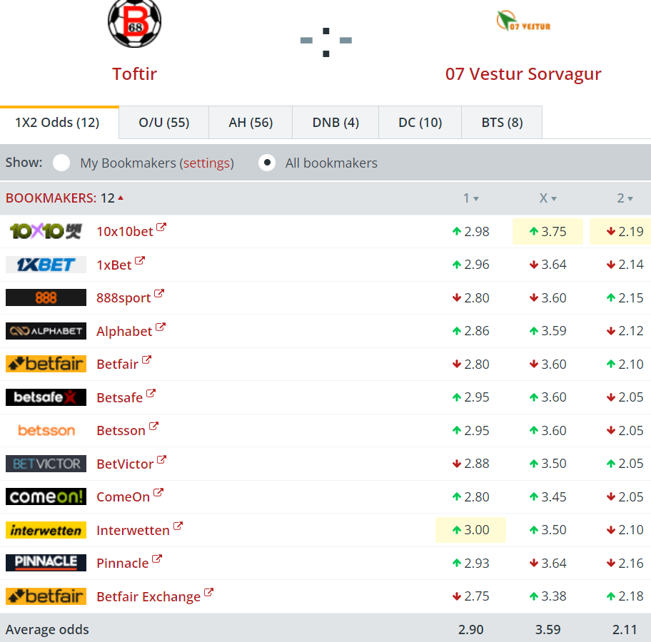 12 altjóða veddingarfyritøkur lata odds upp á dystin, og tær hella til ein sigur til 07 Vestur, men talan er ikki um nakra stóra favorittstøðu.