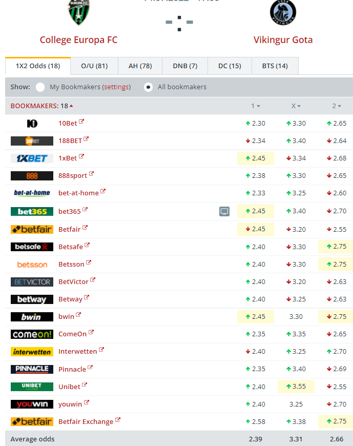 Oddsini uppá heimasigur til Europa FC liggja millum 2,30 og 2,58. Oddsini uppá útisigur til Víking liggja millum 2,60 og 2,75.