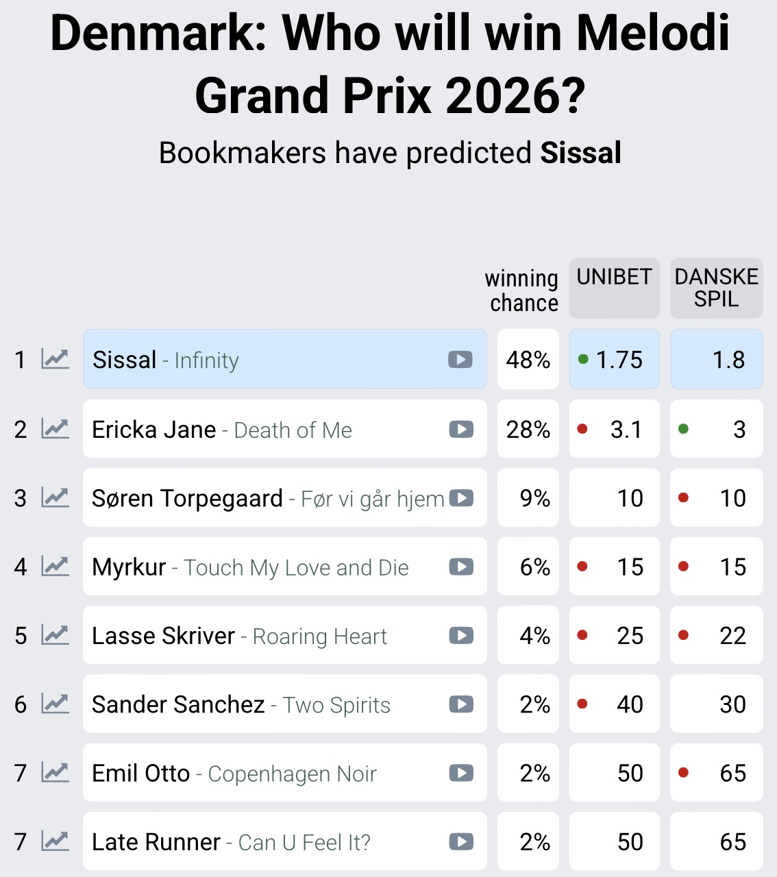 Sambært Danske Spil og Unibet eru møguleikarnir góðir fyri, at Sissal vinnur. Vinnaramøguleikarnir eru 48 prosent. Tað er satt at siga bara Ericka Jane við sanginum "Death of me", ið kann kappast við Sissal. Vinnaramøguleikarnir hjá Ericku Jane, ið sæst á myndini saman við Sissal eru 28 prosent.