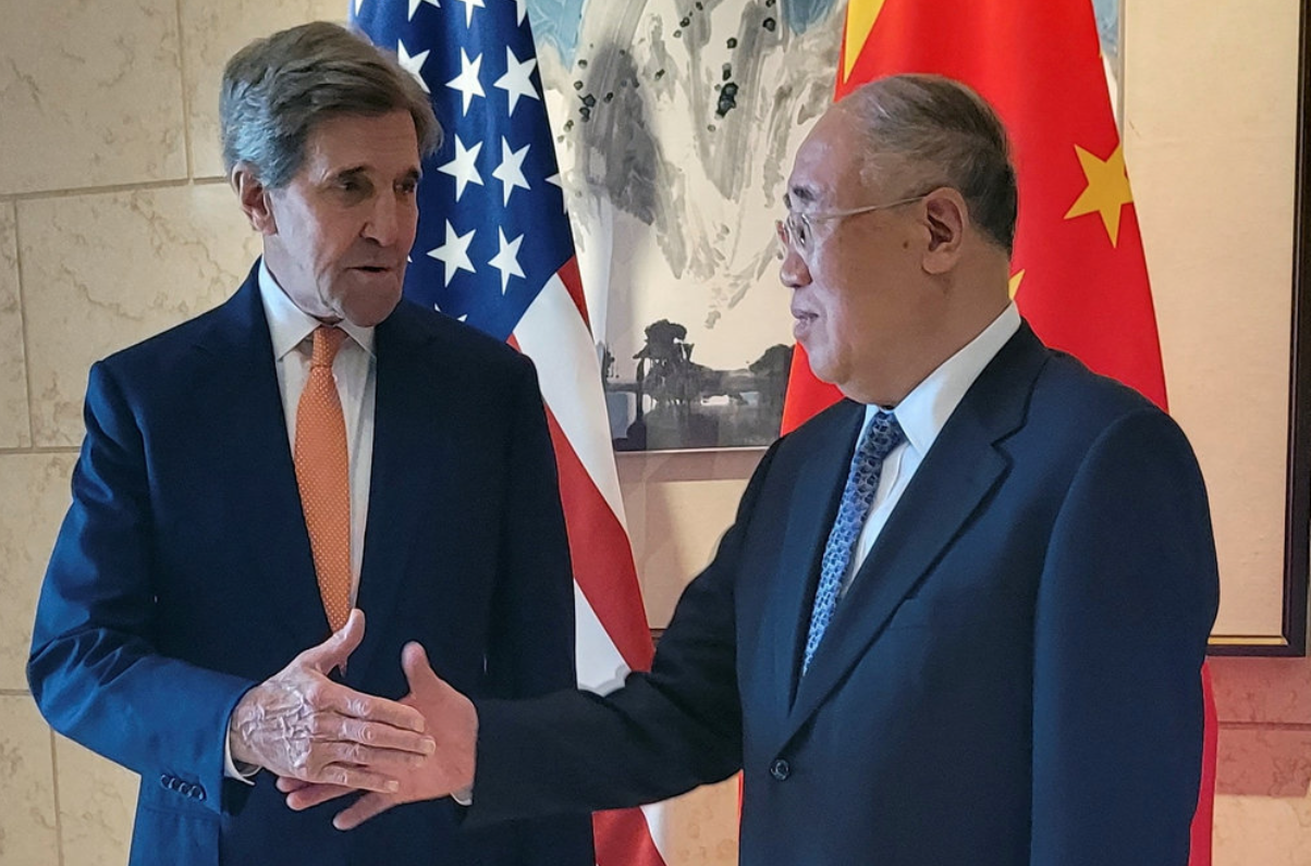 John Kerry, sum er serligt veðurlagsumboð hjá USA, hevur verið á fundi í Bejing við kinesiska starvsfelagan Xie Zhenhua. Hetta er nýggj byrjan í samstarvi millum stórveldini um verðurlagsbroytingar og alheims upphiting.