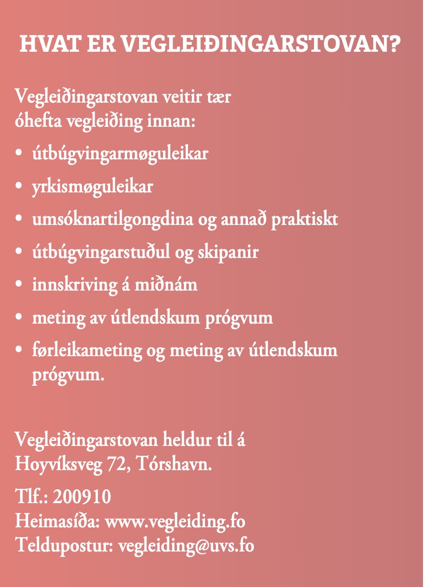 – Men so eru tað onnur, sum hava tørv á antin vegleiðing í at velja útbúgving ella hvussu mann søkir inn á útbúgvingar, kunning um útbúgvingar í øðrum londum ella ynski til eitt komandi arbeiðslív. Á Vegleiðingarstovuni verður skipað fyri bókavegleiðing­ um um útbúgvingarmøguleikar, útbúgvingarval, skiftislestur og sabbatár.