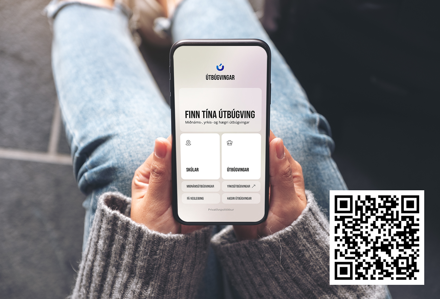 Appin kunnar um allar miðnáms­ útbúgvingar, yrkisútbúgvingar og hægri útbúgvingar í Føroyum. Appin er serliga ætlað teimum, sum á fyrsta sinni skulu velja eina útbúgving eftir loknan fólkaskúla, tá tað kann tykjast avbjóðandi at fáa yvirlit yvir, hvørjir møguleikar eru. Royn appina við at trýsta á QR­kotuna, sum er á myndini, ella tak appina niður á App Store og Google Play, har hon kallast Útbúgvingar.