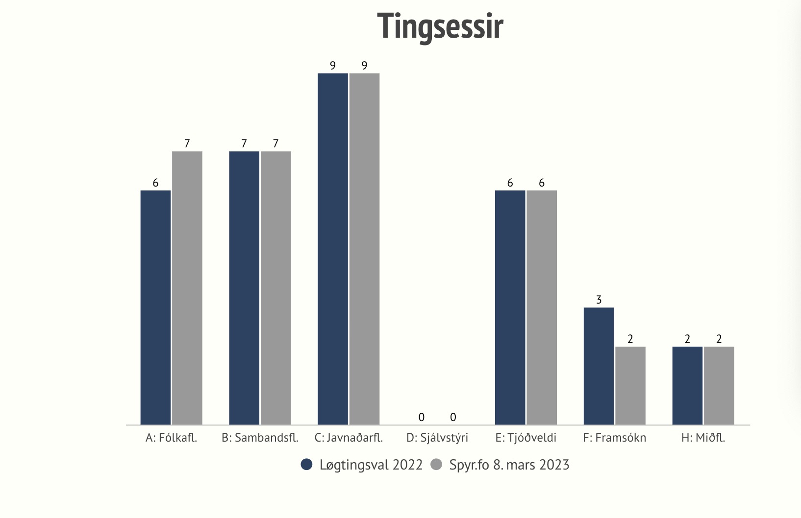 Broyting er hjá øllum flokkum – uttan Framsókn, sum stendur í stað á 7,5 prosentum. Men av tí at býtið millum flokkarnar er øðrvísi, missir Framsókn triðja tingsessin.