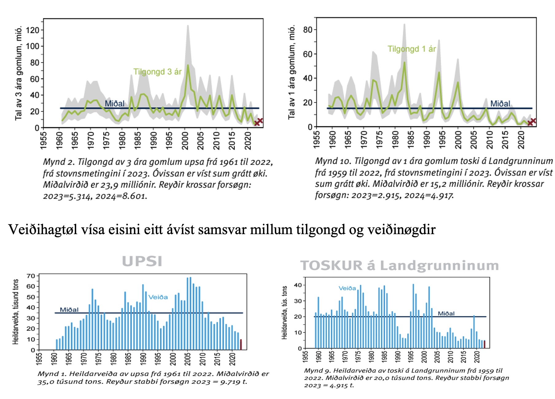 Sambært Havstovuni hevur tilgongdini av toski og upsa verið sum víst í talvunum niðanfyri. Hóast talvurnar vísa, at tilgongdin er skiftandi og óvissan er sera stór, so sæst, at eftir uml. ár 2000, so hevur tilgongdin fyri bæði tosk og upsa verið greitt fallandi.