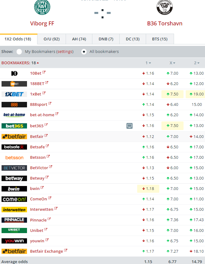 Oddsini upp á heimasigur til Viborg liggja millum 1,14 og 1,18.