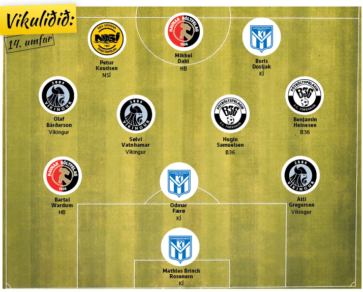 Saman við Mikkel Dahl eru í fremstu røð Boris Dosljak hjá KÍ og Petur Knudsen hjá NSÍ. Dosljak hevur ikki verið fastur maður seinastu ferðirnar. Tað var hann í gjár, og hann takkaði fyri og skoraði tvey tey fyrstu málini. Petur Knudsen er á veg av landinum at spæla fótbólt. Hann segði – fyribils í hvussu so er – farvæl við heimaáskoðararnar í Runavík fríggjakvøldið, tá ið hann skoraði tvey mál í grannauppgerðini ímóti B68.