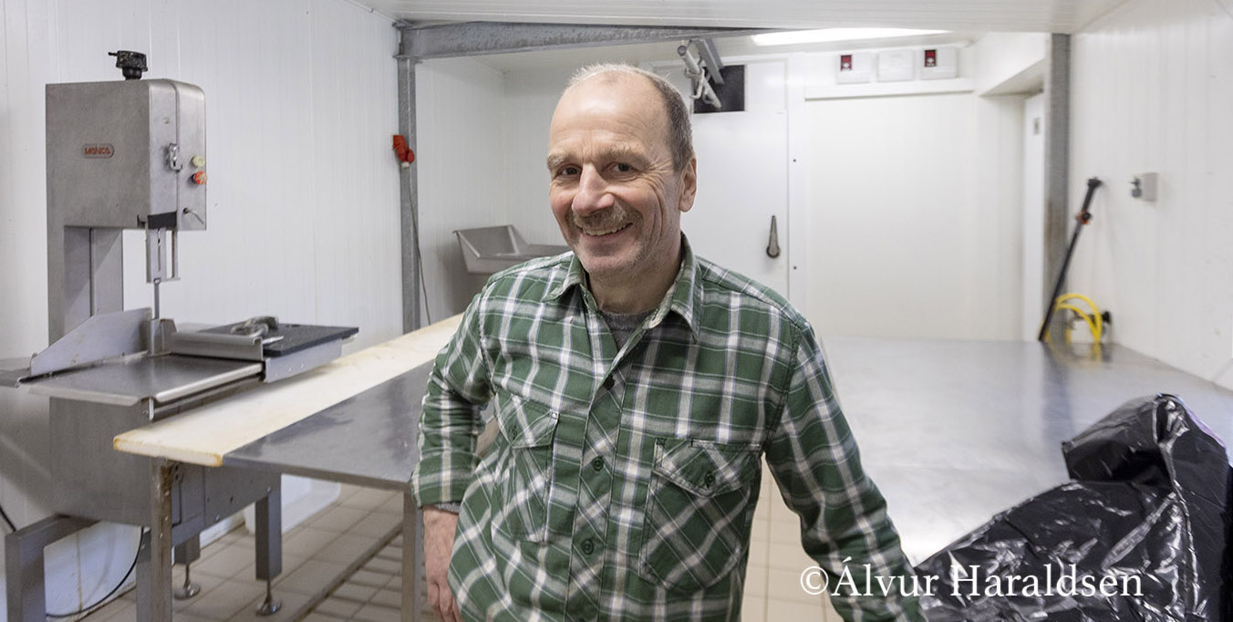 - Umleið 40 neyt verða slaktað um árið, og hetta fer alt fram her niðri í sláturhølunum, sum eg bygdi mær fyri umleið tíggju árum síðan, tá vit eisini fingu bæði køli-og frystirúm.