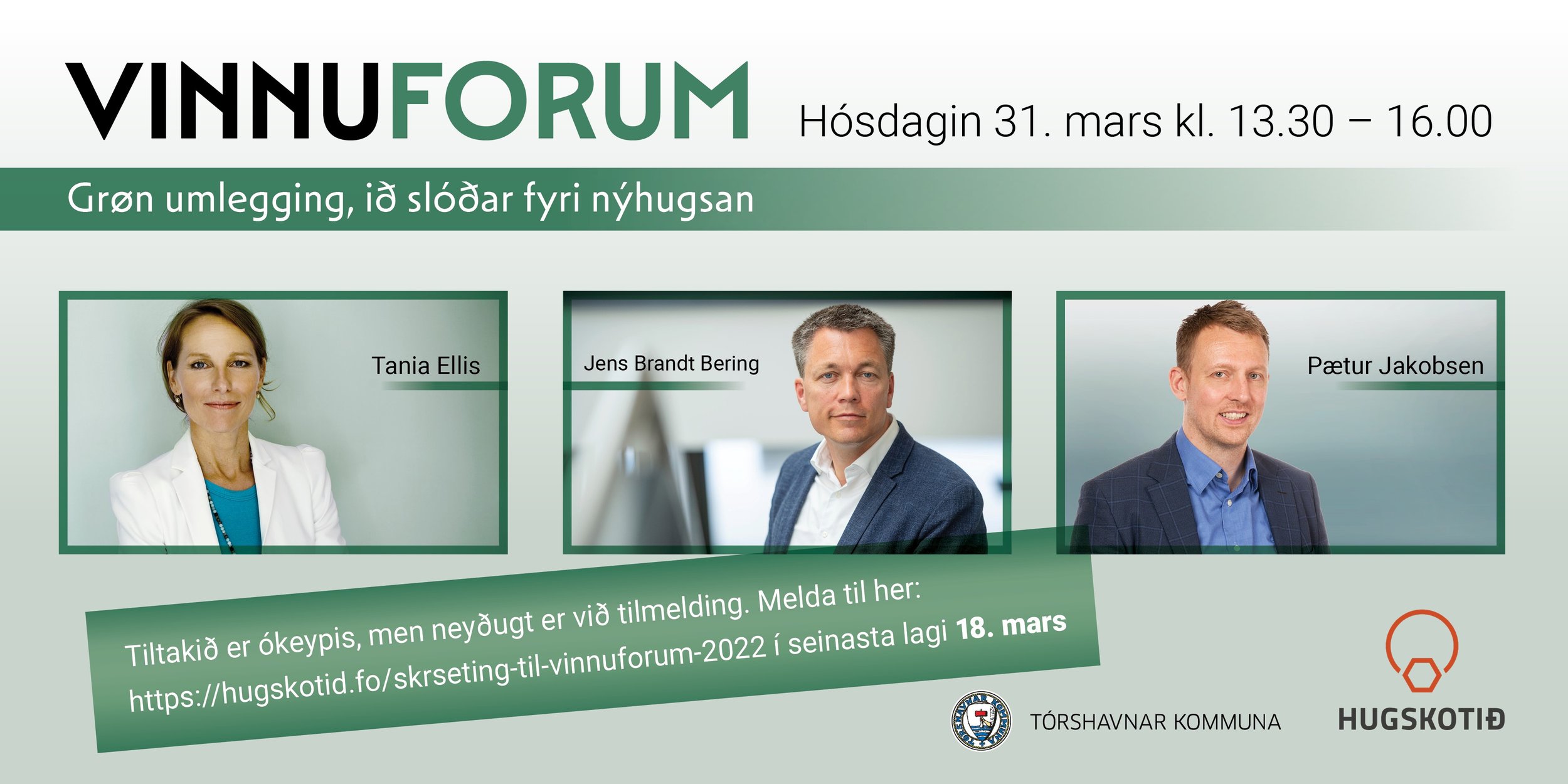 Tórshavnar kommuna og Hugskotið skipa fyri afturvendandi tiltakinum Vinnuforum, har bjóðað verður inn til ein spennandi seinnapart, har vinnan og kommunan fáa høvi at hittast til netverkan og íblástur.