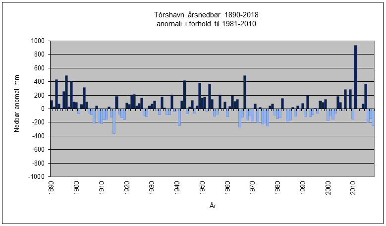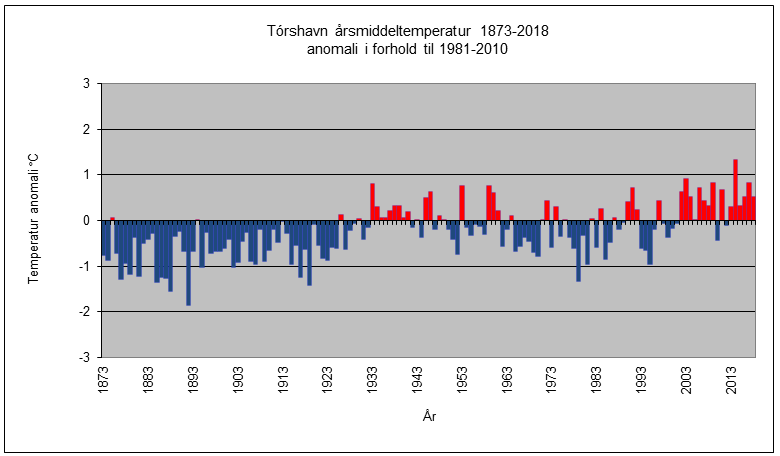 Grafurin vísir miðalhitan í Tórshavn í tíðarskeiðinum 1873 til 2018, har støði verður tikið út frá miðalhitanum í tíðarskeiðinum 1981-2010. Og merkisvert er, at síðan 2003 hava tað einans verið tvey ár, har miðalhitin í høvuðsstaðnum hevur verið lægri enn miðalhitan fyri tíðarskeiðið 1981-2010.